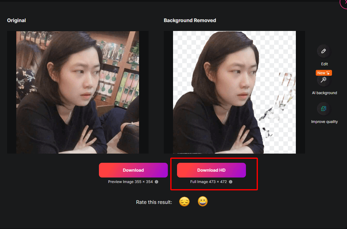 Click “Remove Background”, let AI isolate the subject. It removes the background in seconds. Adjust edges if needed using basic tools. Preview the result. This creates a transparent photo.