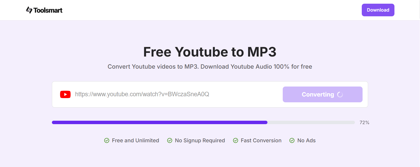 The one I genuinely rely on is Toolsmart’s Free YouTube to MP3. You don’t have to sign up or install anything. Just paste the link and download your audio. It handles large videos with ease and lets you download in 320 kbps, which is great quality. I use it right from my browser while editing posts or picking sounds for a video. It’s quick, simple, and actually makes the content process smoother.