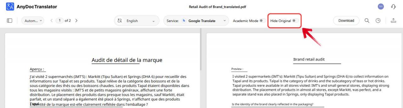 Step 7: If you prefer viewing only the translated content, toggle the "Hide Original" option to switch to a full-screen translation view.