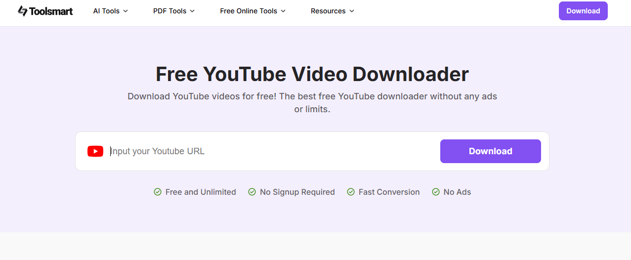 Bien que Freemake Video Downloader soit performant dans de nombreux domaines, Toolsmart YouTube Video Downloader offre une solution plus moderne et optimisée par l'IA. Il est conçu spécifiquement pour YouTube, ce qui le rend idéal pour les utilisateurs qui se concentrent sur cette plateforme.